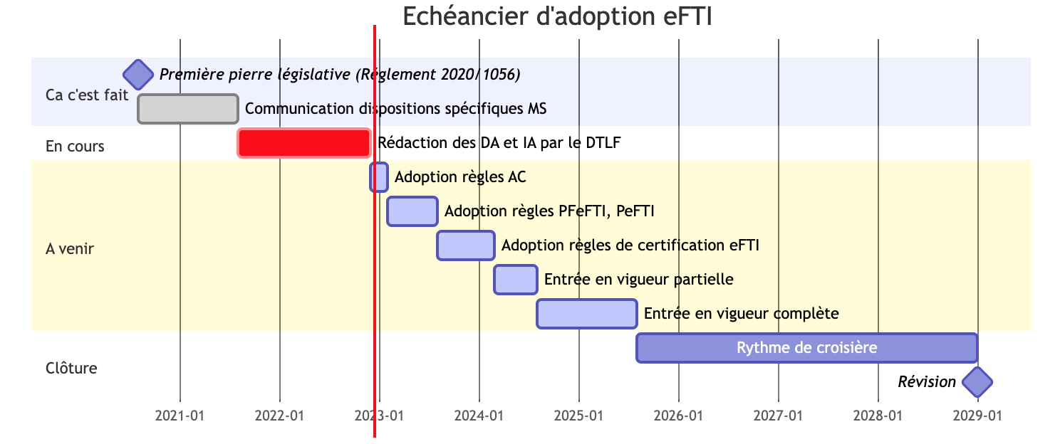 - 08/2023 : Adoption du cahier des charges des plateformes et les prestataires eFTI.